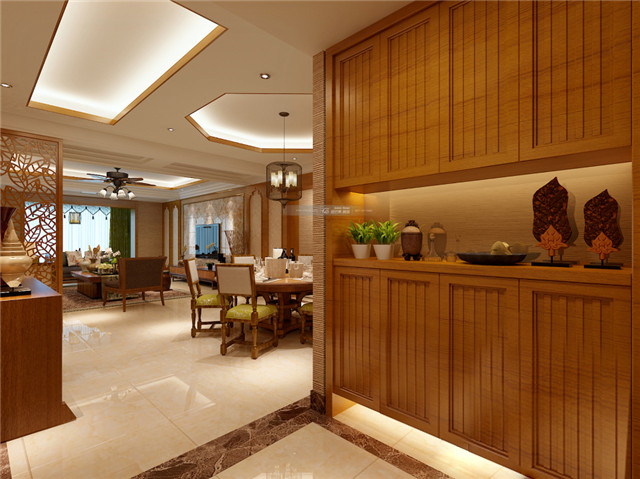 入戶實木玄關柜,彰顯熱情,以亮麗的木色營造既熱烈又有自然氣息的異域東南亞風情。簡約大氣的裝修中帶著幾分拙樸,讓家凸顯氣質的格調。