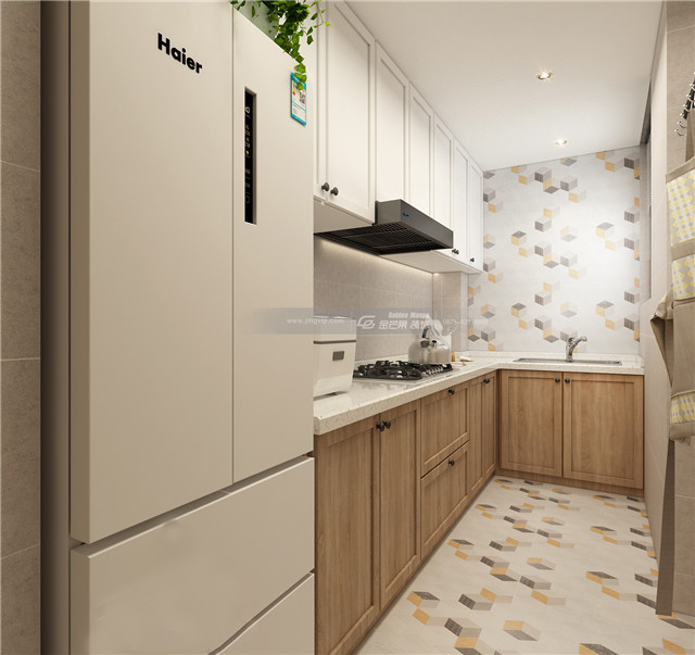 廚房的空間較小,白色貼磚和立方體的花紋給人營造一種視覺特效,使得原本狹窄的空間變得亮堂而舒適,不會(huì)產(chǎn)生過于擁擠的感覺。