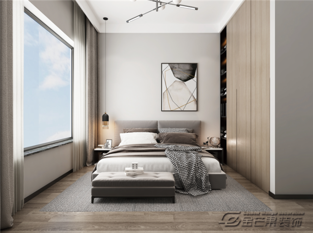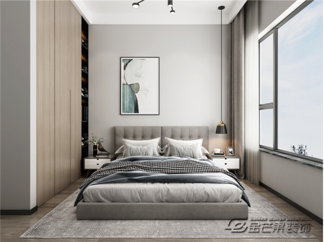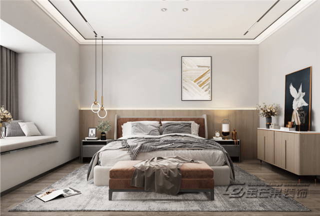 溫馨的木質(zhì)地板,白墻和木飾面,讓空間更有對比性,讓有格調(diào)感。精致的燈飾傳達(dá)不隨意、不敷衍的生活態(tài)度,大氣溫馨時尚的臥室空間。