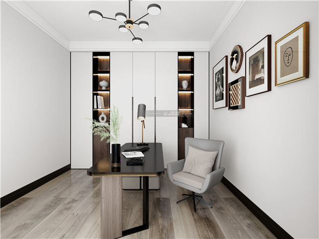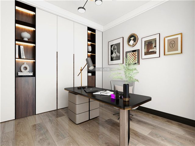 個(gè)性的書桌打破書房的沉悶和拘謹(jǐn),思維也隨之活躍起來(lái)。簡(jiǎn)潔的白和個(gè)性畫飾,渲染藝術(shù)氣息。木材的加入,仿佛沁入了書香氣。