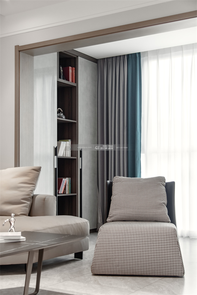 書房,原本戶型是一個不規(guī)則的地方,通過設(shè)計師的改造利用后變成了獨有的造型,柜子兩邊做了隔而不斷的展示柜既增強了書房的采光通風(fēng)性能又增強了與客廳的通透性。