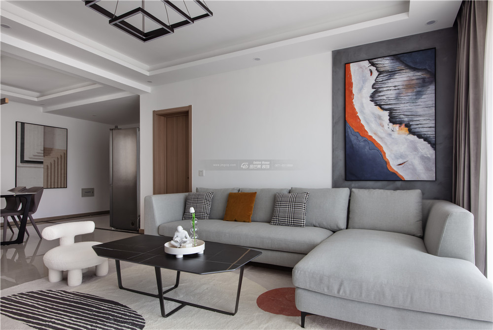 本套昆明裝修現代風格案例采用現代風格經典色系黑白灰,白色墻體使空間看起來更加干凈通透,黑色小桌搭配灰色沙發加以淺灰色地磚,使整體空間更顯沉穩,搭配跳脫的裝飾畫,使空間更顯靈動。