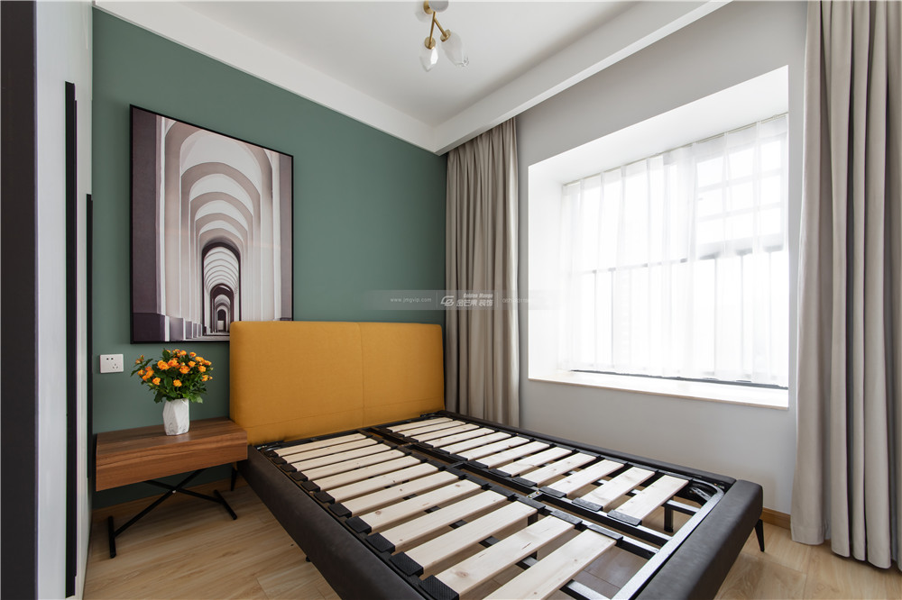 綠色背景墻掛畫和黃色床頭的搭配,增添整個空間色彩感。