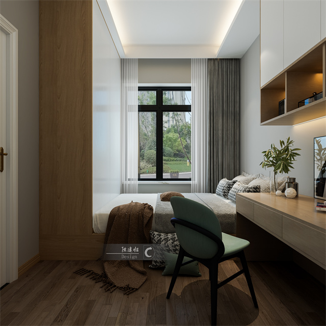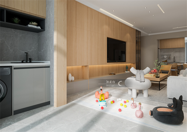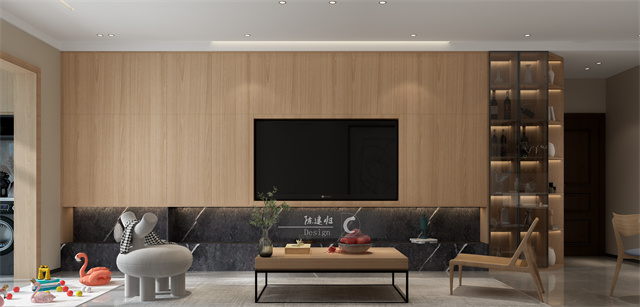 原木色電視背景墻,隱形的柜體一體式設(shè)計(jì),干凈利落,加之電視位置的視覺(jué)調(diào)節(jié)、可愛(ài)簡(jiǎn)潔的家具、溫柔的配色,溫馨又舒適。