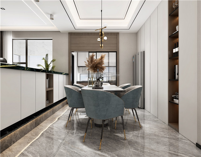 開放式客餐廳形成良好的空間互動,優雅的淺藍色椅子讓清新感撲面而來,整個家居變得溫柔而輕松,餐椅的造型也讓用餐空間變得更加精致起來。