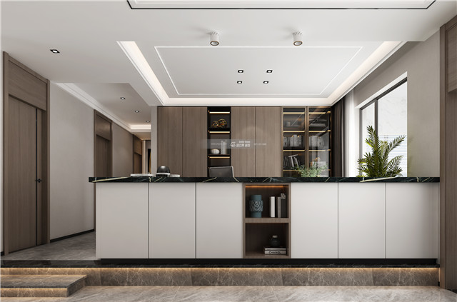 辦公休閑區設置臺面,既可以作為桌子、吧臺,又可作為餐邊柜兼具儲物功能,同時起到隔斷的作用,美觀和實用兼具。