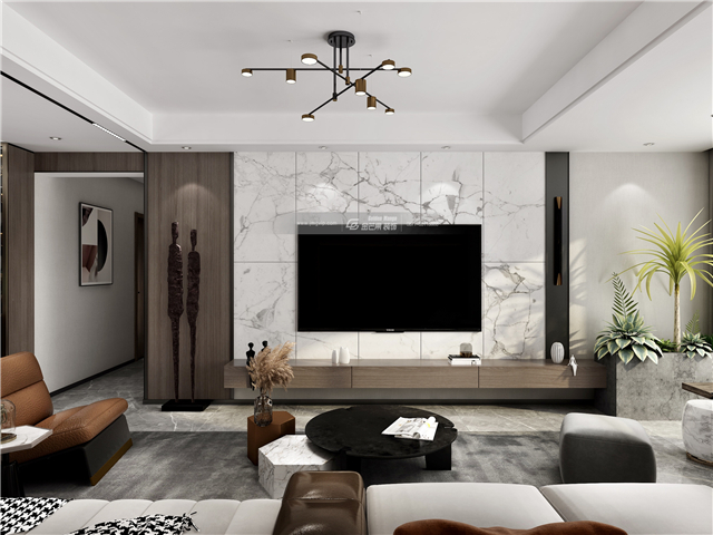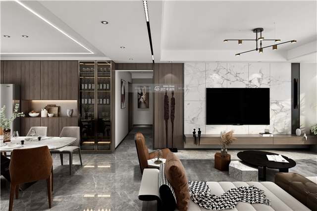 電視背景墻用大理石材增加空間高級感,石材花紋讓空間變得更加有意境和優(yōu)雅。大量的木材的運用增加溫暖感,搭配金屬玻璃的酒柜,時尚感滿滿的同時,家的舒適度也彰然顯現。