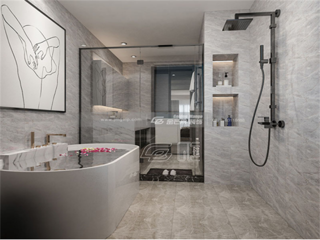 灰白色的瓷磚貼滿整個空間,干濕分離,整體干凈、明亮、美觀。不管是浴缸還是墻上的壁畫都是疲倦的身心所期待的地方。