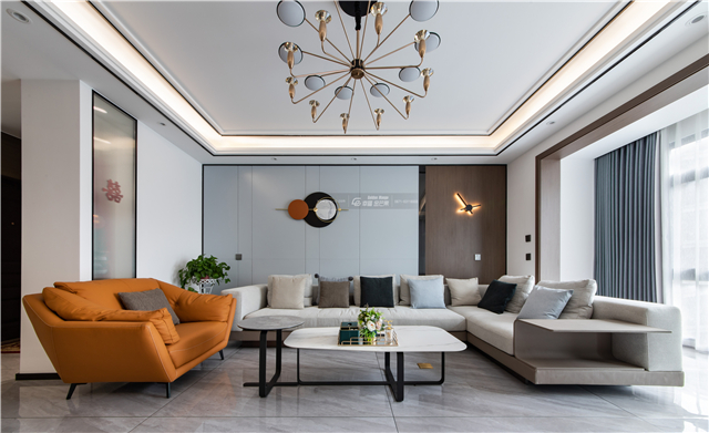 簡約的氣質(zhì)下,新家的現(xiàn)代時(shí)尚感展露無疑。沙發(fā)背景墻融入木飾面,溫暖細(xì)膩的家居體驗(yàn)油然而生。橘黃色沙發(fā),在點(diǎn)亮空間溫暖氛圍之余,增加了一絲摩登的韻味。