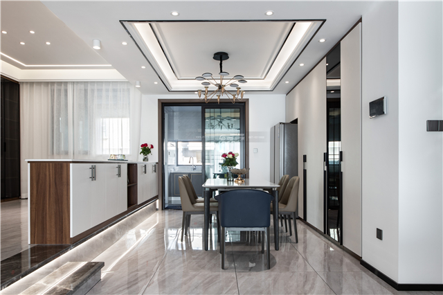 餐桌旁柜體,既可作為區(qū)域間的間隔,也為開闊的空間多增加了一些收納和休閑品茶的功能。