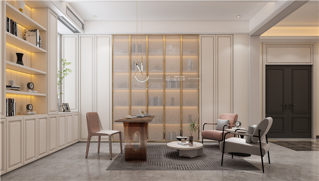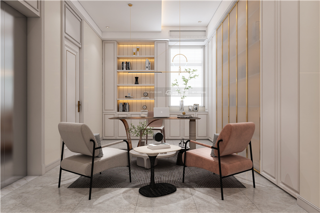 純凈的白色搭配亞克力材質書桌和粉色單椅,簡約的造型搭配更加凸顯溫柔精致。白色木質書柜在燈帶的映襯下溫馨治愈,家變得暖意融融。