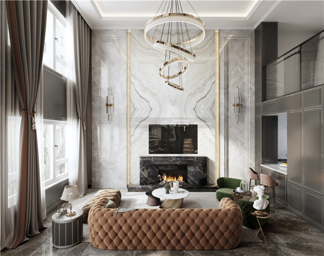 挑高的電視背景墻用大理石做背景,簡(jiǎn)約時(shí)尚,氣度非凡。一盞華麗的燈飾更將空間的氣度拉升。電子壁爐升起溫暖的火焰,橘色沙發(fā)、綠色單椅將空間溫暖的氛圍承托得恰到好處。