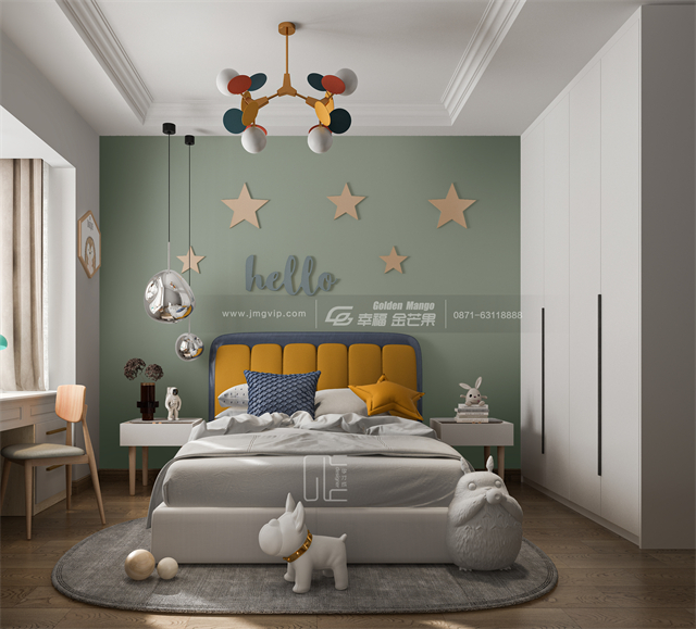 孩子的快樂簡單而純粹。兒童房的空間,豆綠色的寧靜與橙色的熱情碰撞,沖突中彰顯和諧,強烈而舒適,充滿了一種對生活新奇。簡單的星星飾品點綴墻面,把控童趣尺度,具有較長的成長空間氛圍。