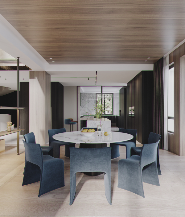 餐廳區(qū)域,桌椅采用暗色系,淡化物質(zhì)存在感,注重品質(zhì)的彰顯,強(qiáng)調(diào)精神內(nèi)在的平靜與安寧。大理石餐桌臺面,更符合意式風(fēng)格定義,傳達(dá)個性與時尚藝術(shù)的魅力。