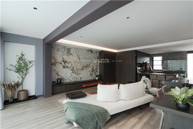 客廳的大落地窗,是明先生的最愛(ài)。將原結(jié)構(gòu)的陽(yáng)臺(tái)推門拆除,按照室內(nèi)的最佳視野定做了落地窗玻璃的尺寸,如一個(gè)天然相框般框出室外畫,變幻著昆明四季的美景。