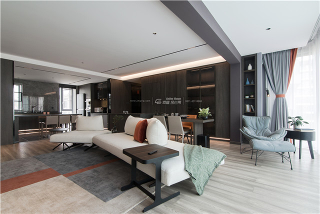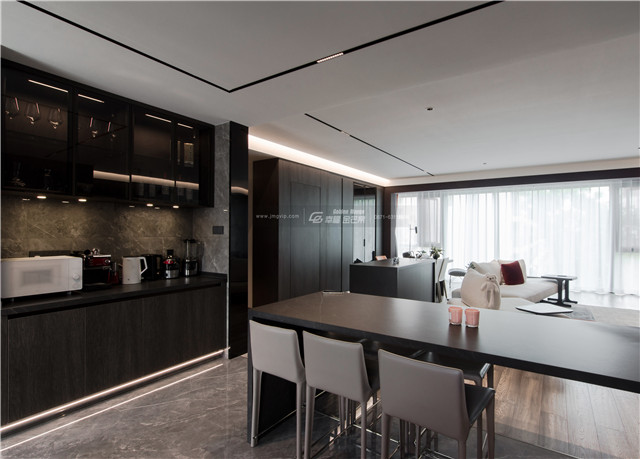 一個(gè)人獨(dú)處的空間,設(shè)計(jì)規(guī)劃也可以任性一些。吧臺(tái)和定制酒柜,正好呼應(yīng)客廳交友聚會(huì)的需求。