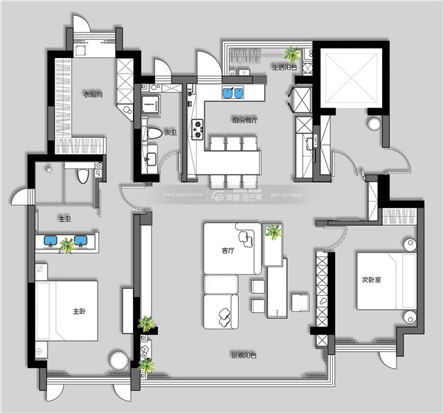 ②、改造出一個(gè)衣帽間,搭配主衛(wèi)生間,主臥設(shè)計(jì)成為一個(gè)功能完備的私密套房。