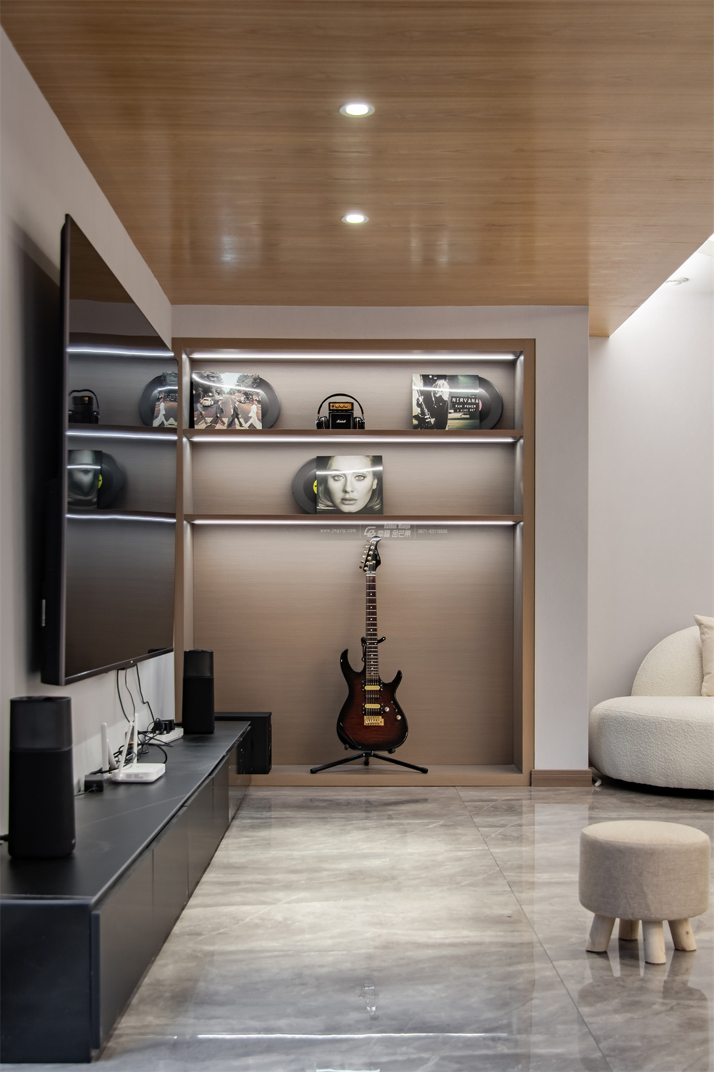 摒棄傳統的電視柜造型,用大理石加燈帶的處理,護墻板后安裝燈帶,相互輝映打造優美的光影效果。是打動人心的溫暖,是別具一格的華麗。