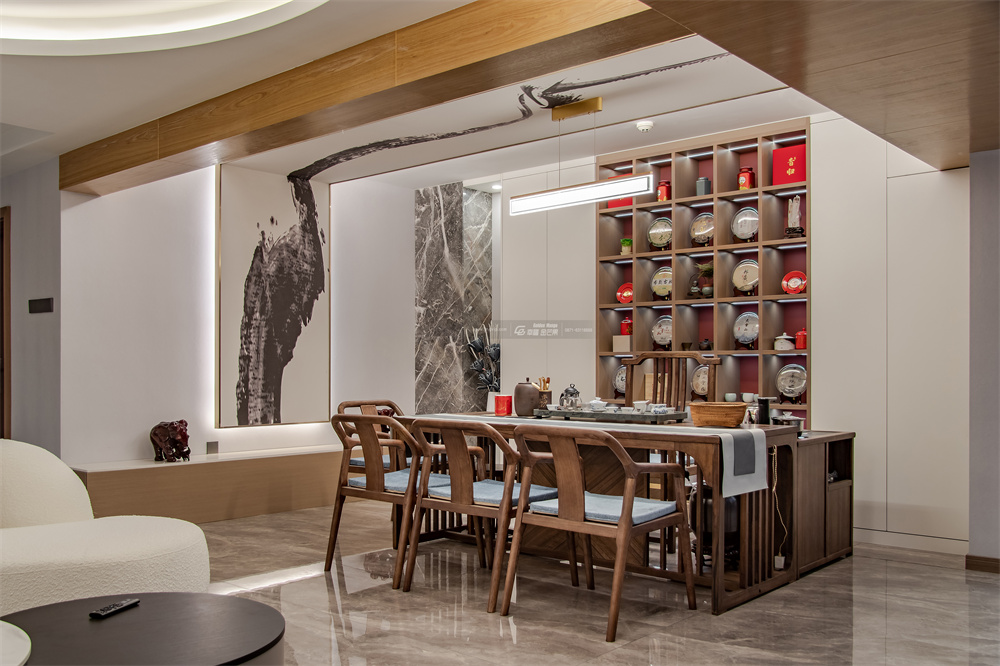 人生一愿,有間茶室,安頓身心,撫慰余生。古樸的茶桌椅、博古架,串聯起貫通古今的時代的印記。一幅山水畫,寄托屋主瀟灑逸然的閑思。偶寄閑情,暫忘喧囂,邀二三知交,煮茶、解語。