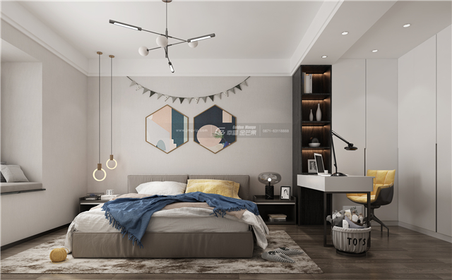 可愛而活潑,通過配色和裝飾的改變,活潑的裝飾,有趣的造型,明媚的氛圍,空間特色突出,頗具個性,而又慵懶輕松,營造適合舒睡和空間功能性較強的氛圍。