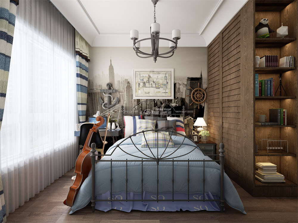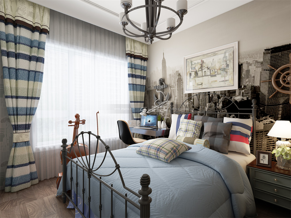 藍(lán)灰色的主題令空間更加理性與靜謐,也更符合男孩子的氣質(zhì),原木柜體帶來溫潤之感,而床、吊燈的鐵藝材質(zhì)又為空間增添干練、硬朗之感,二者巧妙融合,令空間更具韻味!