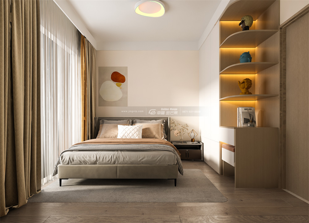 次臥柜體沿著墻面定制,一墻到頂,還設(shè)計了弧形的開放格,放上喜歡的書籍或擺件,別有一番韻味,靜謐又美好,實用性也高!