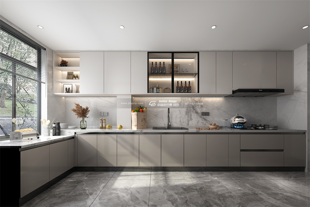 L型廚房設計讓廚房的空間利用率直線飆升,增加廚房空間收納空間的同時增強廚房的兼容性,廚房臺面干凈整潔,做起飯來得心應手,當陽光透過窗戶照射進廚房,松弛感充盈整個靈魂,做飯也不再是一件煩悶的事。