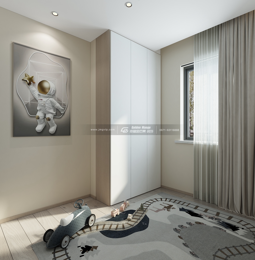 男孩房以時(shí)尚的淡藍(lán)色和灰色為主,設(shè)計(jì)上采用多種元素,汽車(chē)、火車(chē)、航天、太空,搭配充滿(mǎn)童趣的軟裝,為孩子定制一個(gè)造夢(mèng)空間。