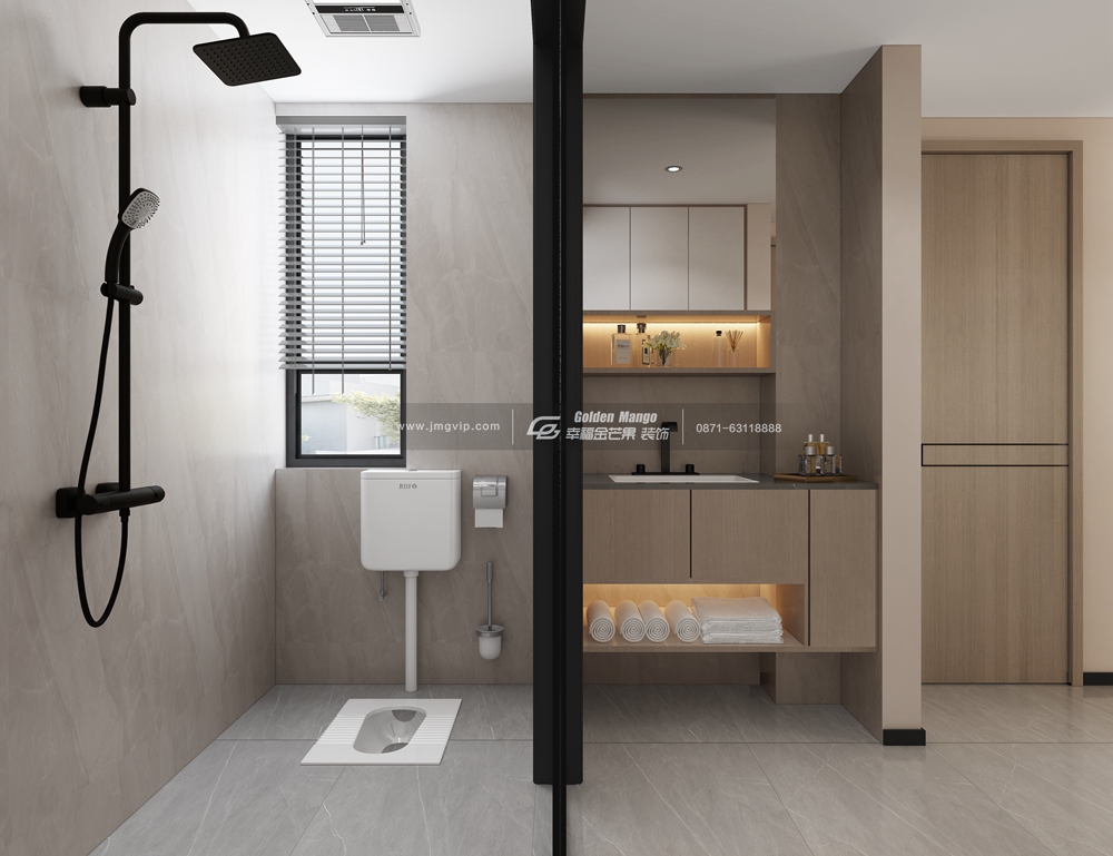 衛(wèi)生間以杏色和淺灰色的大理石瓷磚整體鋪貼,高級(jí)質(zhì)感直接拉滿(mǎn);靠窗位置設(shè)置淋浴區(qū),方便通風(fēng)的同時(shí)也能保持衛(wèi)生間干爽潔凈,百葉簾保護(hù)隱私的同時(shí)不失時(shí)尚美觀。
