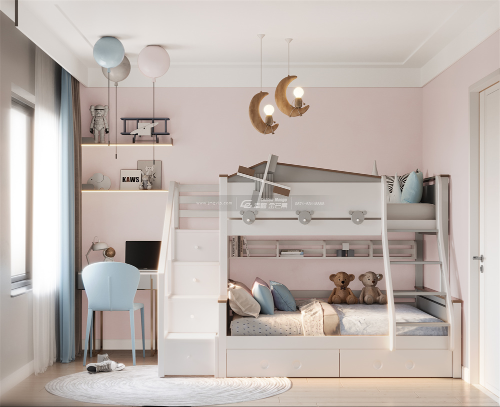 粉色打底,藍色與白色點綴,這就是小女孩兒童年夢的樣子,純凈無瑕,天真奇幻,童話般的空間,總能裝下孩子無數(shù)的奇思妙想。