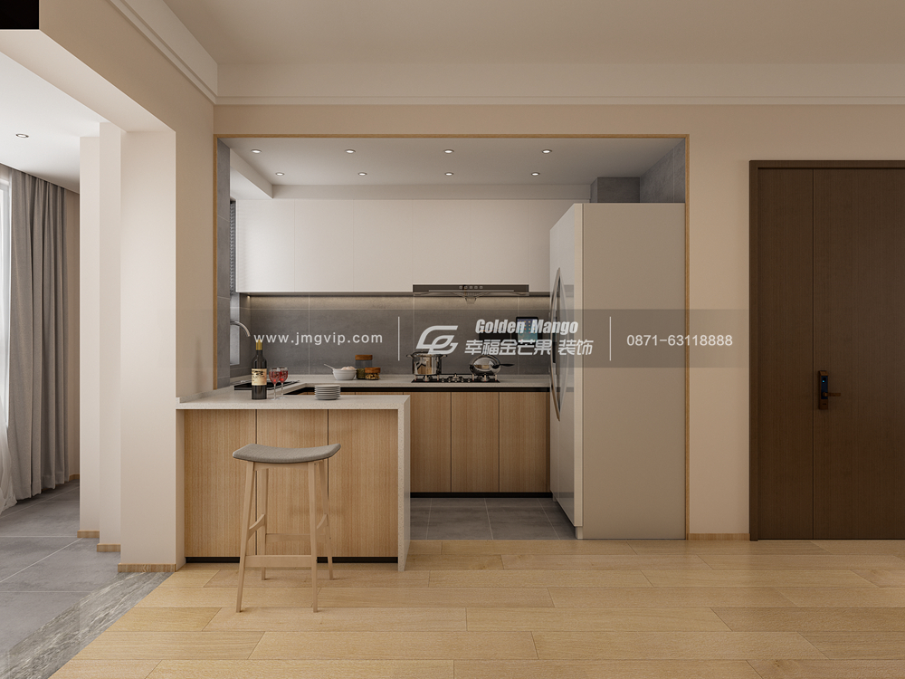 廚房空間與餐廳空間以小巧的吧臺設計作為隔斷,保持空間的通透性;原木風的柜體搭配純白的操作臺面,恰當的留白與廚房吊頂的小射燈,溫馨的廚房氛圍帶來人氣偷偷地煙火氣,不僅暖胃,更加暖心。
