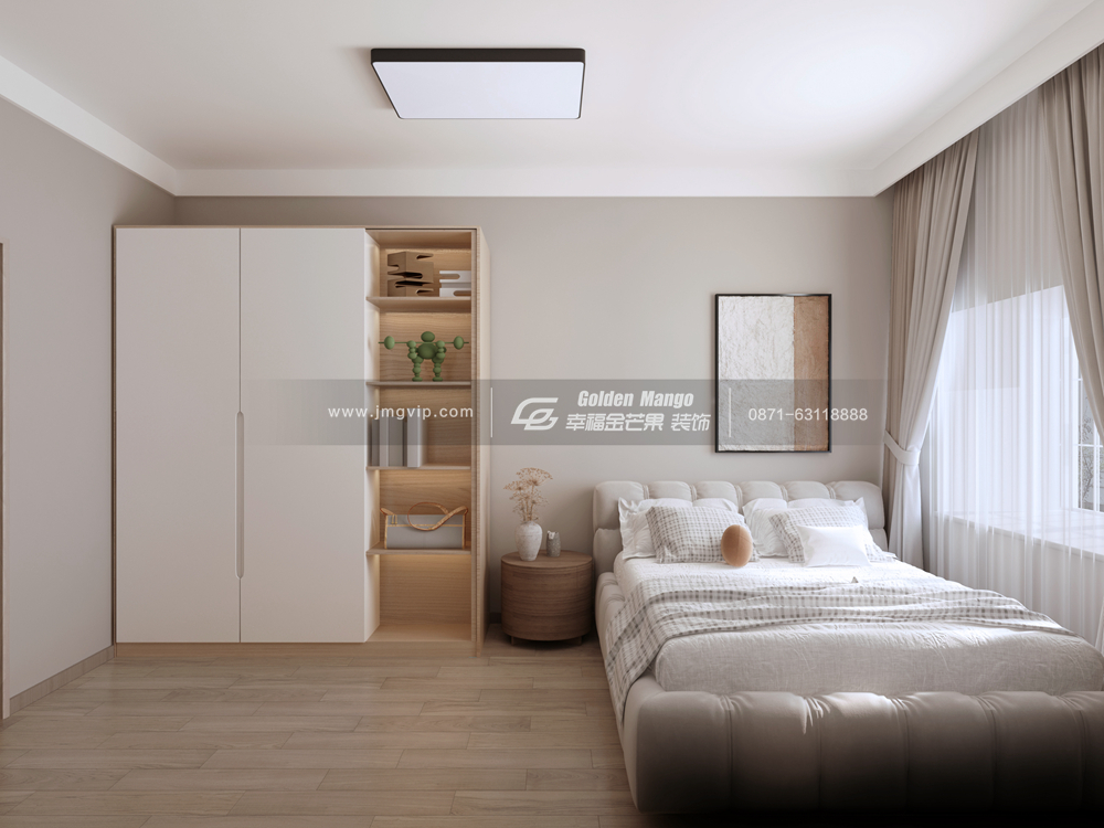 次臥主打柔軟清新風格,原木色地板和置物柜溫馨自然,床體靠近飄窗位置,每天睡在床上就能感受清晨的第一縷陽光,美好的一天由此開始。