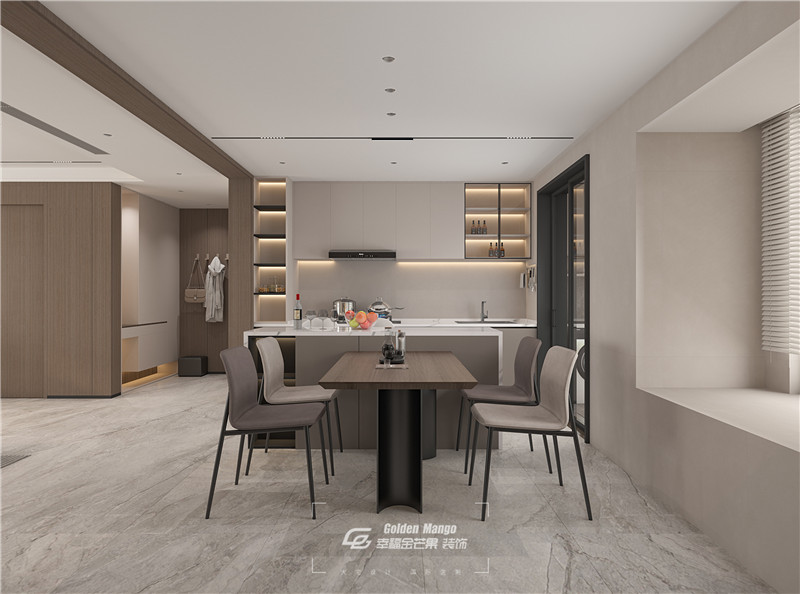 家是屬于自由的,空間也是。開放式的布局,一側(cè)是中廚空間的煙火寥寥,另一側(cè)是西廚空間的滿滿情調(diào)。餐桌島臺置于其間,空間互相串聯(lián),動線順暢無拘。應(yīng)季時蔬,自在烹飪,最本真的味道里,是最幸福的家庭時光。