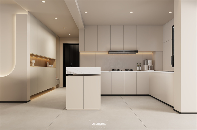 餐廚區墻頂同色,櫥柜餐桌椅選用了與客餐廳一樣的奶油色系,在視覺上放大了空間。在空間中大量運用曲面的墻體,增強空間的趣味性。