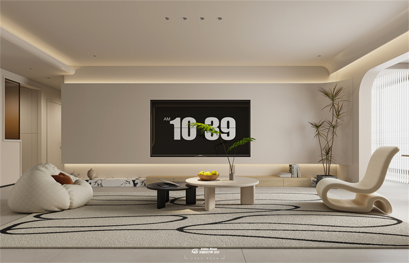客廳沙發消失術,沙發的顏色與背景融為一體,使整個空間更加地輕盈與放松。用曲線將軟糯的溫柔質感盡情揮灑,展示著優雅且恬靜的魅力。