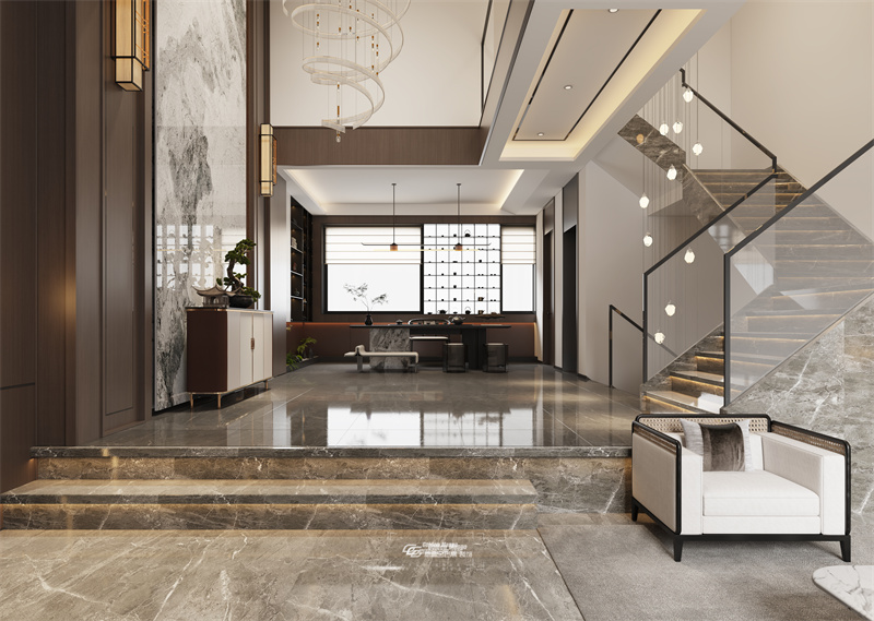 背景墻是大幅的水墨山水傾瀉而下,挑空的設計更顯別墅空間的氣勢恢宏,同時也彰顯出屋主高瞻遠矚的生活態度。一進入空間,一番自由大氣的遼闊景象躍然于眼前,提升居住舒適感。