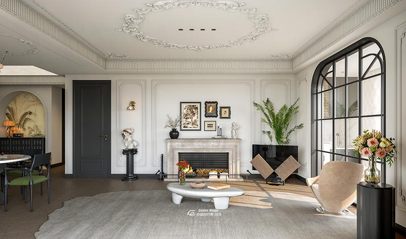 墻面有精致護(hù)墻板與裝飾壁燈,搭配雕塑、壁爐及裝飾畫,整體風(fēng)格偏藝術(shù)、典雅,營造出富有格調(diào)的氛圍,用于日常休憩、交流,展現(xiàn)屋主對生活美學(xué)的追求,是家中兼具美觀與功能的公共活動區(qū)域。