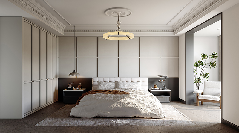 臥室設(shè)計同樣別具匠心。床頭背景墻采用白色皮革硬包及金屬扣條裝飾,簡約中透著精致。兩側(cè)床頭柜風(fēng)格迥異,一邊是深色木質(zhì)柜體搭配金屬臺燈,另一邊則是白色懸空柜搭配簡約燈具,完美詮釋了美式風(fēng)格的隨性與不羈。
