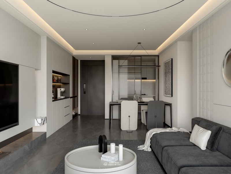 客餐廳一體化設(shè)計,流暢開闊??蛷d深灰沙發(fā)配淺色抱枕、毛毯,圓形茶幾實(shí)用美觀。餐廳區(qū)域桌椅簡約,一旁柜體有開放儲物區(qū),擺放咖啡具等,滿足收納與展示。天花板圓形線條貫穿,增強(qiáng)空間整體感,營造簡約時尚的生活場景。