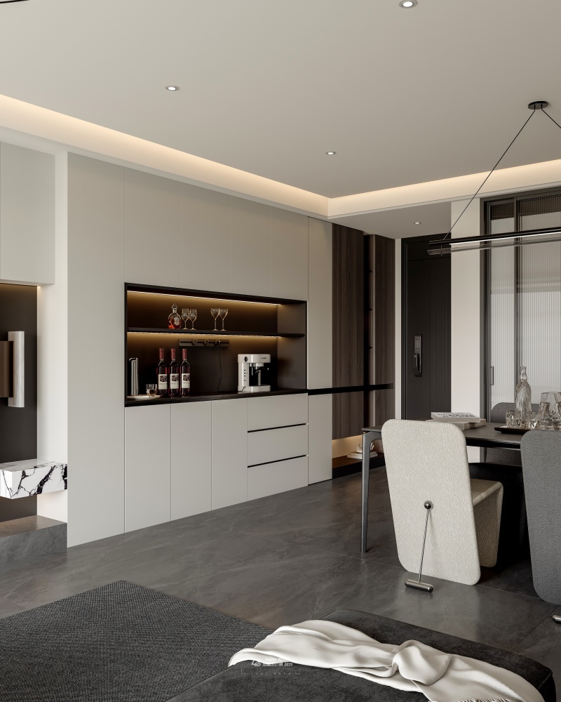 餐廳區(qū)域,簡約餐桌搭配造型獨(dú)特的灰白椅子,線條利落。天花板線性燈帶與筒燈結(jié)合,柔和照亮空間。地面深灰地磚與淺灰地毯呼應(yīng),整體設(shè)計通過簡潔布局、精致細(xì)節(jié),詮釋出現(xiàn)代簡約風(fēng)格的時尚與實(shí)用 。