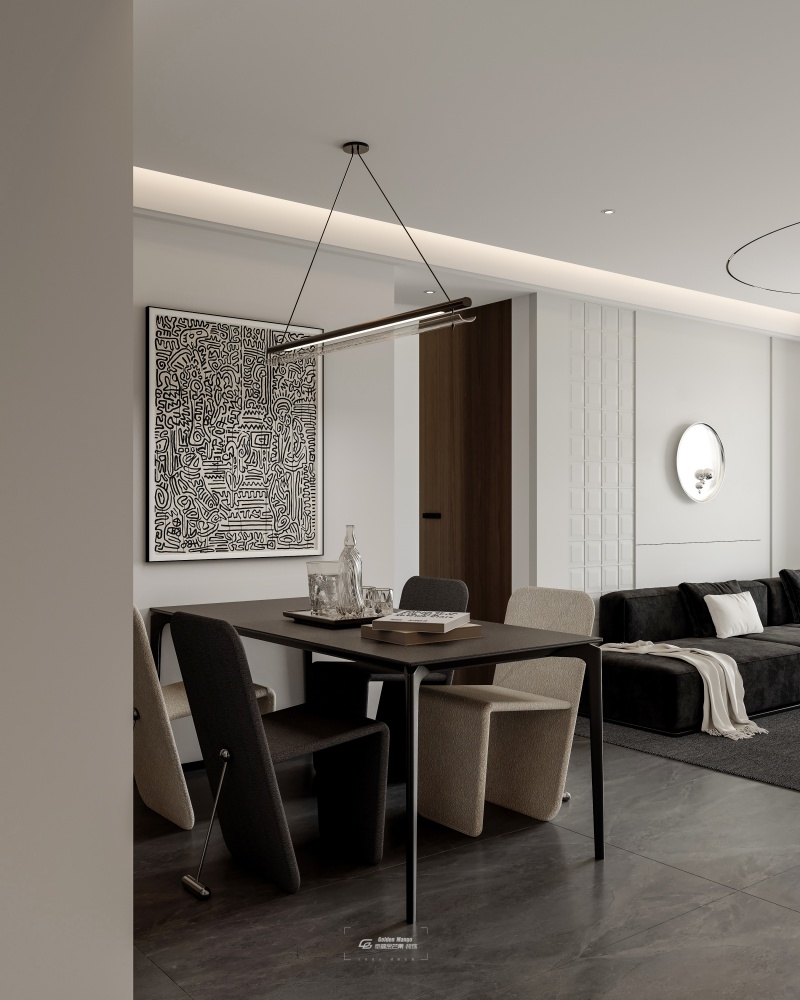色調(diào)沉穩(wěn),深灰餐桌搭配黑白椅子,簡潔利落。上方單盞吊燈簡約現(xiàn)代,墻面大幅藝術(shù)畫豐富視覺。一側(cè)推拉門節(jié)省空間,另一側(cè)可看到客廳部分區(qū)域,空間過渡自然,營造出簡約又具藝術(shù)氛圍的用餐環(huán)境。