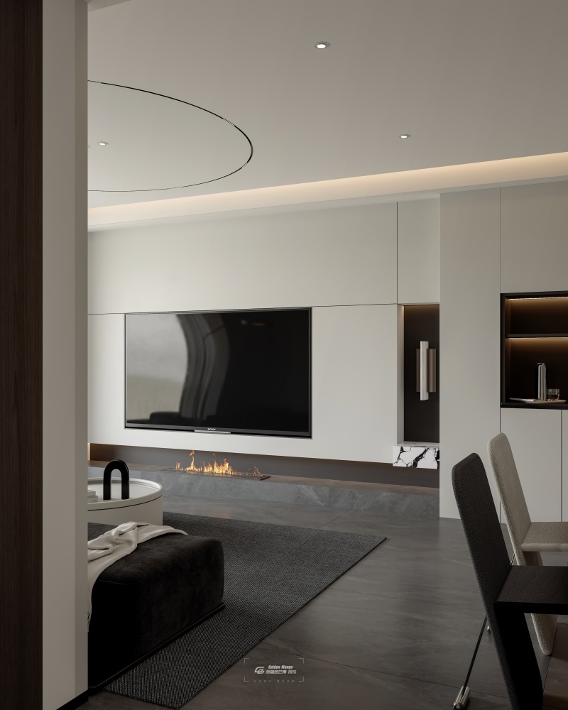 天花板的圓形線條與嵌入式筒燈、線性燈帶結(jié)合,豐富空間層次又顯精致。客廳區(qū)域,大白墻嵌入巨幕電視,下方嵌入式壁爐增添溫馨感,旁側(cè)開放柜體陳列物品,兼具收納與裝飾。