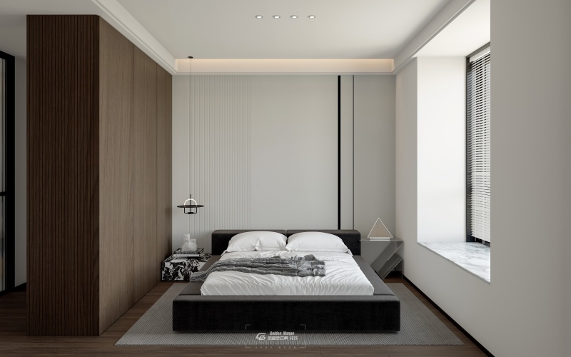 深灰床體與淺白墻面、床品形成對比,溫潤木質(zhì)墻板增添自然質(zhì)感,地面深淺搭配,層次豐富又不雜亂。