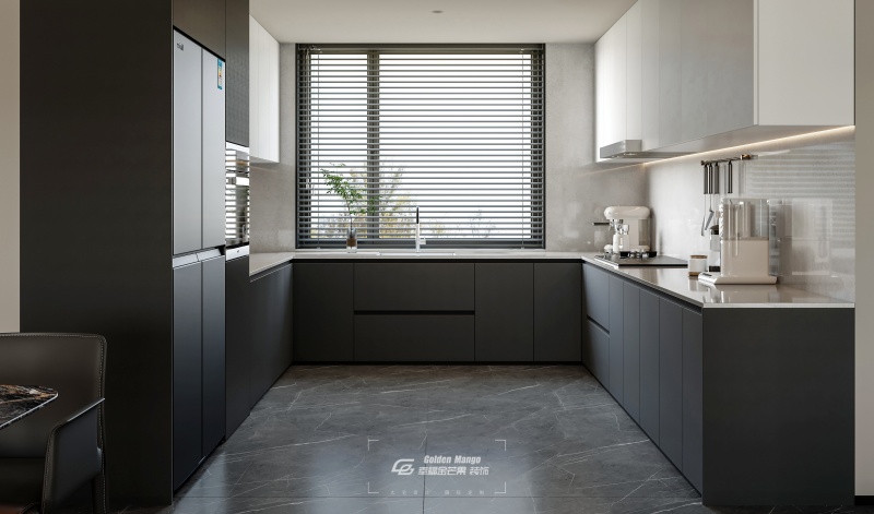 廚房區域以簡約而實用的設計為特點。整體櫥柜采用深色系搭配黑色大理石臺面,營造出一種低調奢華的氛圍。