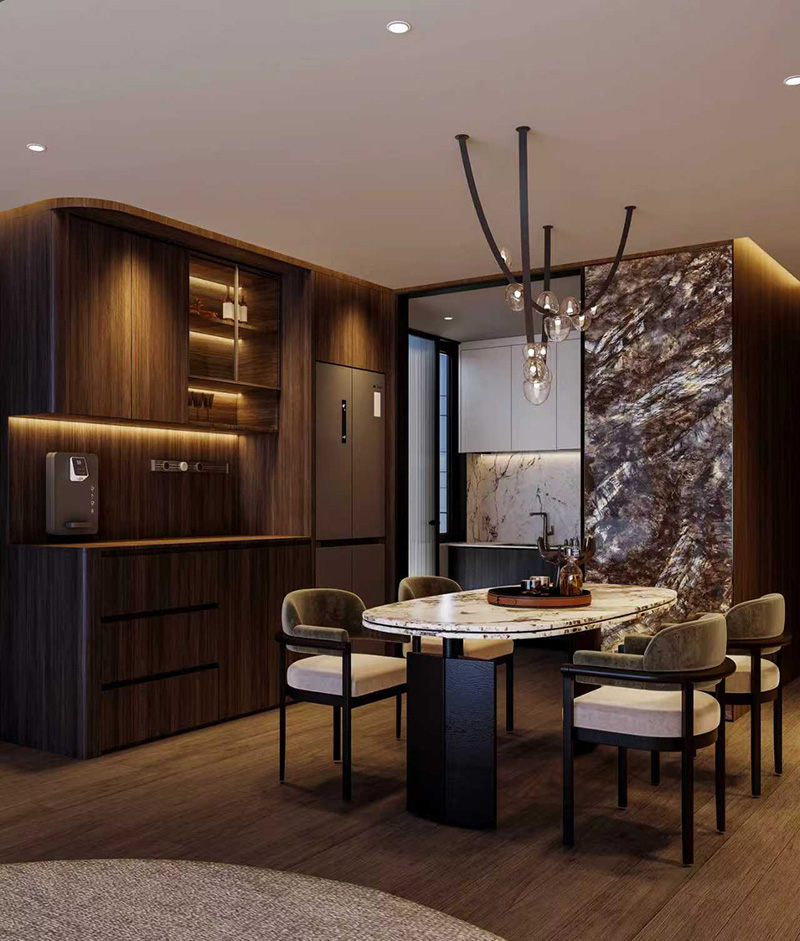 石材與木質的對話:客廳以天然大理石背景墻為視覺焦點,紋理如潑墨山水般恣意流淌,搭配深色木飾面定制柜體,理性與藝術在此碰撞。餐廳延續這一脈絡,巖板島臺與胡桃木餐桌組合,溫潤中透出克制的華麗。