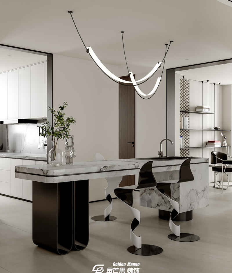 n 從客廳步入餐廳,視野豁然開朗。金芒果的設計師將餐廳與廚房打通,用一個中島臺作為自然過渡,既增強了家人間的互動,又讓空間顯得更加通透。餐桌的選擇堪稱點睛之筆—— 一張長度 2.2 米的巖板餐桌,搭配 6 把淺灰色皮質(zhì)餐椅,簡約中透著高級感。餐桌上方懸掛著一盞造型獨特的吊燈,黑色金屬框架搭配白色燈罩,燈光灑下時,給食物鍍上了一層溫柔的濾鏡。