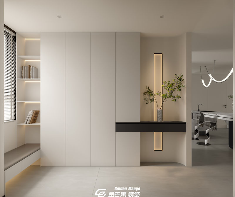 n 作為家的第一印象,玄關(guān)的設計既要實用,又要彰顯品味。金芒果在這里做了一個 L 型的玄關(guān)柜,底部留空方便放置常穿的鞋子,中間的臺面可以隨手放下鑰匙與包包,上方的柜體則能收納換季的衣物與雜物。最讓人驚喜的是玄關(guān)柜上的細節(jié)—— 一盞小小的臺燈,一個造型別致的花瓶,幾支新鮮的綠植,讓每天出門與回家都充滿了儀式感。