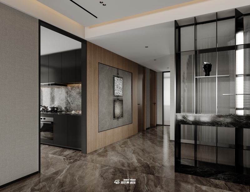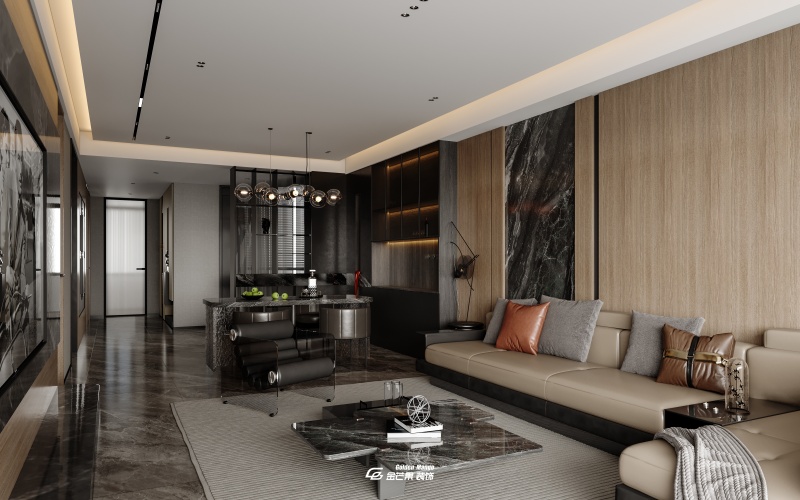 淺灰、木色、深灰為主色調(diào),地面通鋪大理石紋理地磚,延伸空間感,上方線性燈光與球形吊燈呼應(yīng),展現(xiàn)出意式極簡(jiǎn) “少即是多” 的美學(xué),讓空間既顯開闊又充滿細(xì)節(jié)。