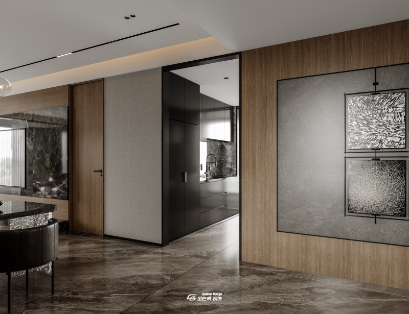 餐廚區(qū)以深色木質(zhì)高柜為背景,搭配內(nèi)嵌式暖光燈帶,營(yíng)造出沉穩(wěn)內(nèi)斂的氛圍。
