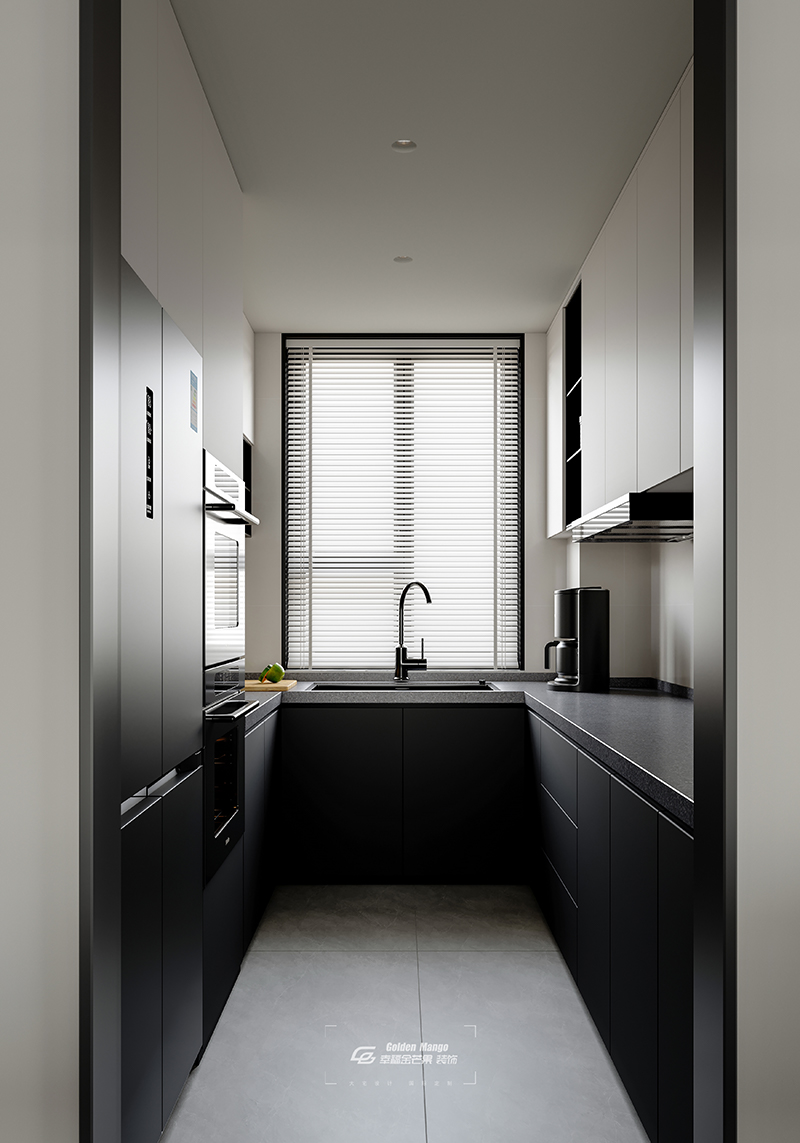 廚房的設計更是利落得很!黑白配色,看著就干凈清爽。黑色櫥柜把各種雜物都藏得嚴嚴實實,臺面一塵不染,強迫癥看了都得偷著樂。U 型布局把空間利用得剛剛好,洗菜、切菜、烹飪,動線流暢得像流水線。